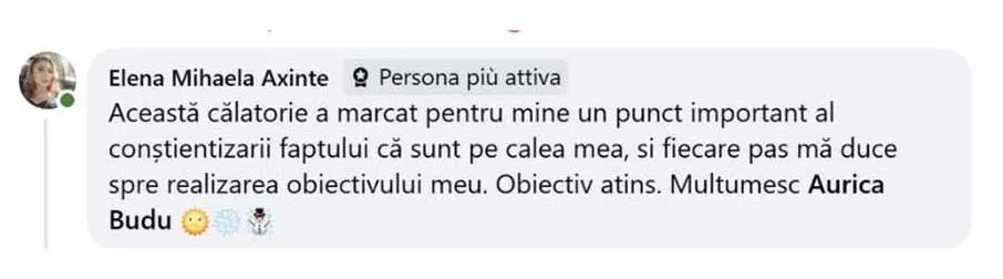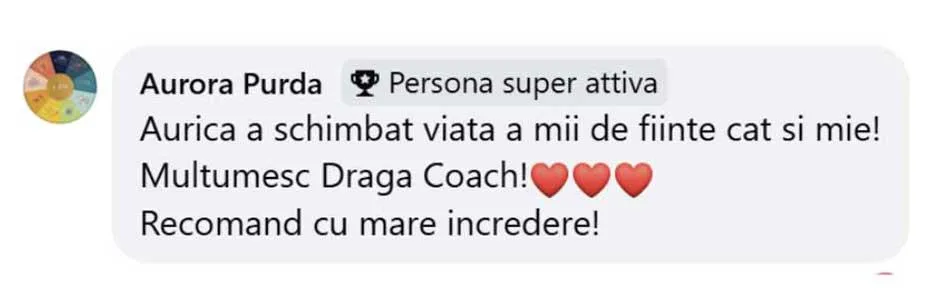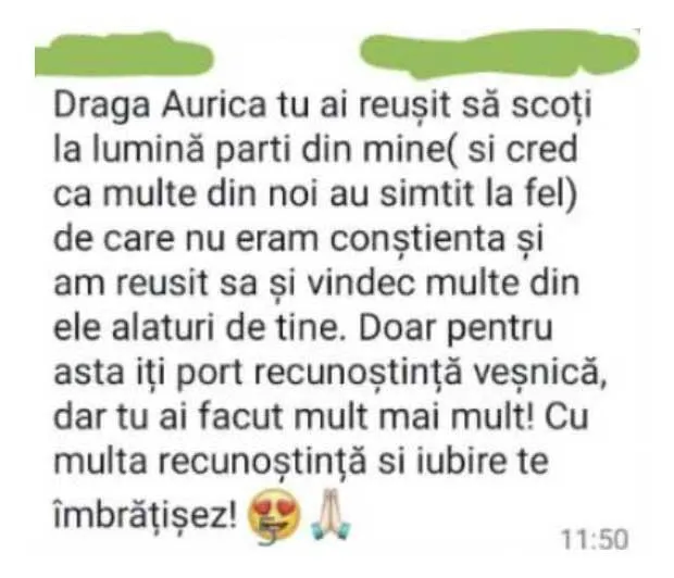 "Aurica m-a ajutat să înțeleg că tot ce căutam în exterior era deja în mine. Acum am claritate și curaj să îmi urmez visurile fără să mai aștept permisiunea nimănui."